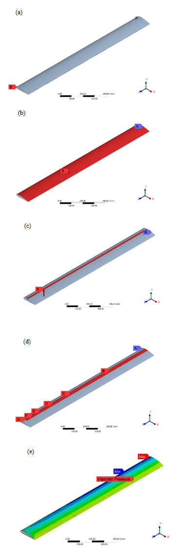 Lo presentado en las Figuras 2 y 3 es la aproximación más cercana a la distribución de presiones real, trasladar estos valores al modelo de elementos finitos es una tarea compleja, al igual que recrear las cargas en una prueba experimental del ala, por eso deben hacerse algunas simplificaciones. La literatura recopilada presenta diferentes alternativas, Shabeer y Murtaza [31] ponen una carga puntual en el centro de presiones del perfil debido a que es allí donde se concentra la resultante de las fuerzas aerodinámicas. Kanesan et al. [21] dividen por secciones el ala, aplicando un valor de presión específico a cada parte, formando una distribución parabólica, de tal manera que la suma de las secciones es la carga total. Son et al. [4] realizan un modelo de la interacción fluido-estructura para relacionar directamente el campo de presiones aerodinámico con la estructura del ala. Kumar y Roy [20] seleccionan una presión uniforme sobre la parte inferior del ala y fijan uno de sus lados como condición de contorno. Ünlüsoy [9] divide la cuerda en 10 secciones y aproxima para cada una de ellas la presión resultante. En este trabajo se hará la comparación de algunas de estas opciones para evaluar las diferencias entre las soluciones.