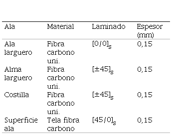 Patterson y Grenestedt [8] diseñaron un ala de 6 metros de envergadura para probar la manufactura de un solo curado empleando fibras de carbono, en este caso los largueros fueron distribuidos de tal manera que no fuera necesario usar costillas en la estructura, la fuerza de sustentación fue dividida a lo largo del ala para hacer el análisis de esfuerzos. Ünlüsoy [9] realizó el diseño estructural de un ala adaptativa usando aluminio en sus partes y un tejido ortótropo de fibras de vidrio para la superficie.