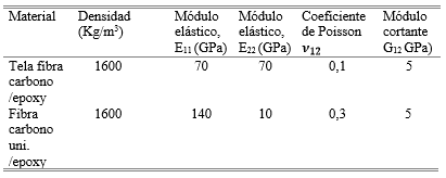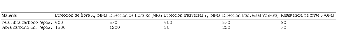 En el diseño se probarán fibras de carbono con resina polimérica, las cuales tienen buenas propiedades elásticas y mecánicas, como se observa en la Tabla I y Tabla II, [7][33].