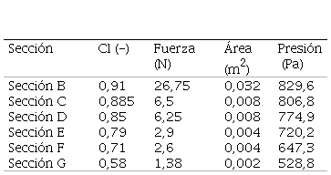 En la cuarta condición se asumió una distribución de presión decreciente desde la raíz hasta la punta del ala sobre otra franja aproximada en el centro aerodinámico, Figura 7(d). Esto se hizo teniendo en cuenta los valores del coeficiente de sustentación a lo largo del ala, proporcionados por el software XFLR5. Ponderando un valor promedio del Cl para cada sección es posible hallar su aporte a la fuerza de sustentación y, posteriormente, con el área de la sección, encontrar la presión que actúa. A continuación, se muestran en la Tabla III los valores de cada sección.