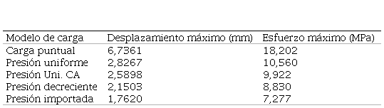 En los casos de carga se usó el laminado [0/90]s con 4 mm de espesor. Los resultados obtenidos de cada caso se pueden observar en la Tabla IV, los valores difieren poco, mostrando distribuciones de desplazamiento y esfuerzo máximos del mismo orden de magnitud. La carga puntual presenta los valores más altos, ya que esta genera un mayor momento sobre el ala, lo cual incrementa los esfuerzos. Los resultados no difieren mucho entre la segunda y tercera condición, esto debido a que la resultante de la presión se mantiene casi en el mismo lugar. La cuarta condición muestra menores valores que las anteriores condiciones, en este caso la resultante de la presión está más cerca de la raíz del ala, generando menor flexión. De manera general, la deformación y esfuerzo máximo disminuyen a medida que los modelos se hacen más aproximados a las condiciones reales, siendo, en general, más conservadores.