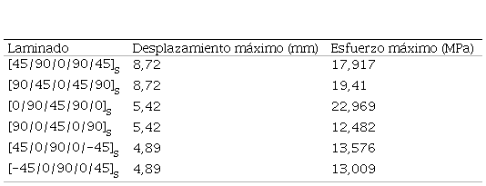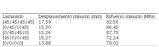 Los dos primeros laminados tienen la misma distribución de fibras de 45° y 90° con una secuencia diferente, los resultados son muy similares y muestran el mayor valor en desplazamiento máximo. En los siguientes dos laminados se remplazó una lámina de 45° por una de 0°, mostrando una disminución importante en el desplazamiento máximo, el laminado con las fibras de 90° en exterior muestra también una gran disminución en el esfuerzo máximo. Teniendo en cuenta lo anterior, se consideró que el laminado debe tener dos laminas a 0° ya que la estructura mostraba mayor rigidez, por último, se combinaron con dos láminas de 45° mostrando los mejores resultados en cuanto desplazamiento y esfuerzo máximo.