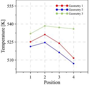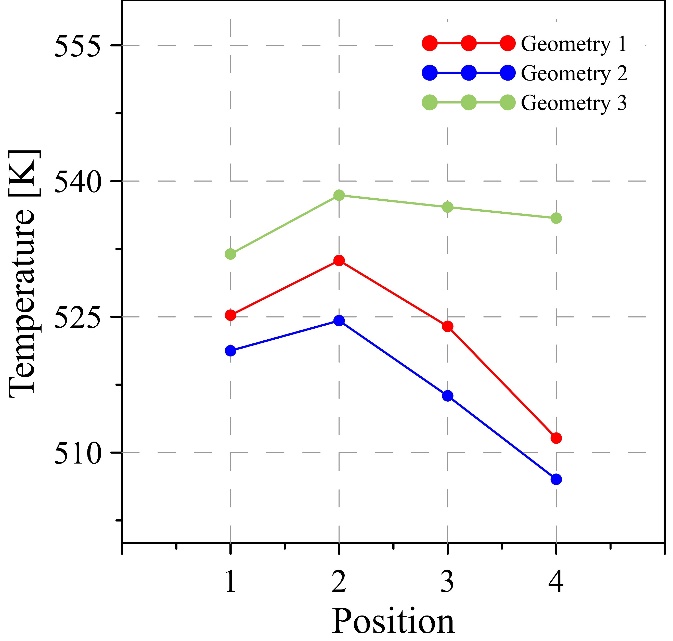 Fig. 10 shows the surface temperatures for the three geometries analyzed. It can be seen that the walls of the geometry with snake path reach temperatures of 511 K - 532 K, while the geometry with oblique fins reaches temperatures of 507 K - 525 K; on the other hand, the walls of geometry with parallel paths have temperatures between 531 K - 539 K, being this the geometry with the highest surface temperatures on its walls, which benefits the voltage and electric current generation.
