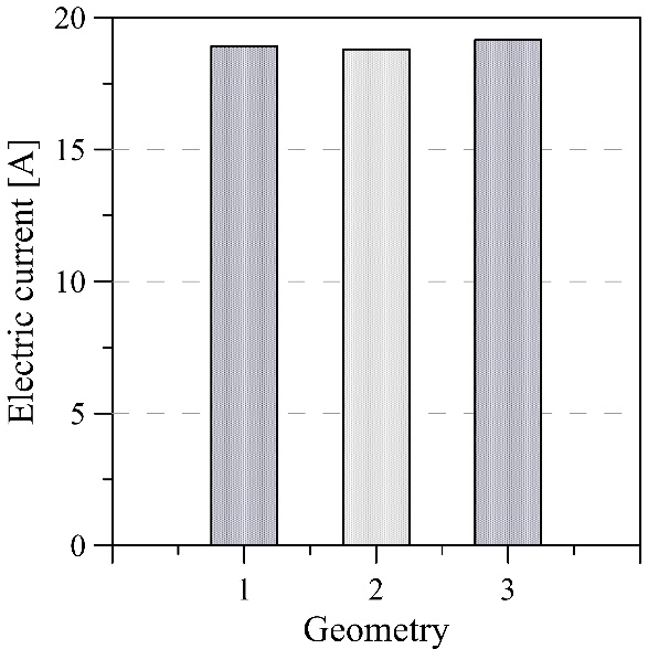 Once the temperature on each side of the modules is obtained and considering the information of the data sheet provided by the manufacturer, it was possible to calculate the total voltage and electric current that the TEMs would generate with the respective temperatures (Fig. 12 and 13). According to the results, the geometry with the highest values of surface temperature and heat transfer is also the one that generated the greatest voltage and electric current since the production of these two depends strictly on the temperature difference on each side of the module. However, the optimal geometry selection does not only depend on the voltage and electric current that can be generated but also on variables such as pressure, turbulence kinetic energy, and turbulence Eddy dissipation rate, since poor performance with regard to these factors can compromise the integrity of the engine under study.
