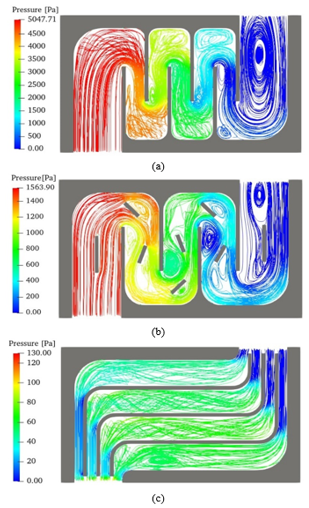 On the other hand, the turbulence kinetic energy (TKE), associated with the presence of eddies, features the highest values in the geometry with a snake path, whereas the minimum is established in the geometry with the parallel path (Table III). This is related to the flow lines shown in the pressure profiles, where a greater presence of eddies is observed in Fig. 15a and Fig. 15 b.