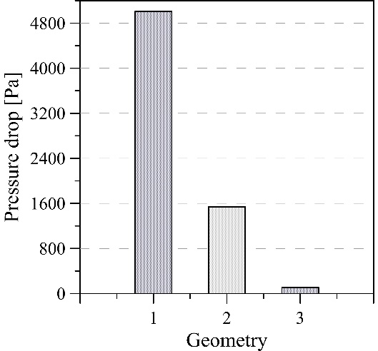 As mentioned before, Paraview shows the exhaust gases pressure through the streamlines of the different heat exchanger geometries (Fig. 14); Thus, it was possible to calculate the total pressure drop of the fluid for each proposal. As shown in Fig. 15, the geometry that generates the greatest pressure drop is the one with a snake path (5010 Pa), while the geometry with a parallel path generates the least pressure drop (109 Pa). It should be noted that a high-pressure drop value indicates that the exhaust gases outlet pressure is being forced to reach the TEG outlet, so with respect to this factor, the geometry with the best performance is the one with a parallel path.