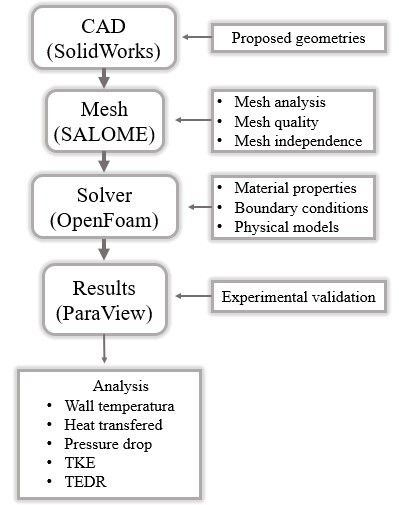 Taking into account the literature review, three different configurations for the heat exchanger were developed to verify the influence on energy recovery. To determine an optimal geometry for the heat exchanger, CFD simulations were employed to reveal the overall behavior of the exhaust gases when flowing through the different geometry arrays. The methodology implemented is shown in Fig. 1.