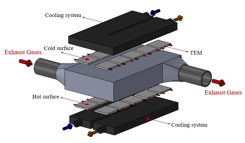 The proper operation of the thermoelectric devices in terms of power recovered is determined by the voltage and current generated, which, in turn, depends on the temperature difference between the hot and cold ends on each side of the modules, as shown in Fig. 2. Since the cooling system used for this generator is powered by water at room temperature (300.15 K), the greater the temperature of the exhaust gases, the greater the temperature difference. The heat transfer from the exhaust gases to the TEM can be increased through heat exchangers, so this study is mainly dedicated to promoting an optimal geometry that benefits not only the heat transfer but also most of the factors involved in the energy recovery process.