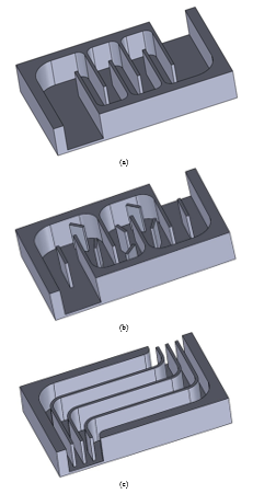 The behavior of exhaust gases flowing through these exchangers was simulated using OpenFOAM® software. The geometry patterns correspond to snake paths (Fig. 3a), small oblique fins (Fig. 3b), and parallel paths (Fig. 3c). All of them were created in SolidWorks, and the meshing analysis was performed in the open-source software SALOME.