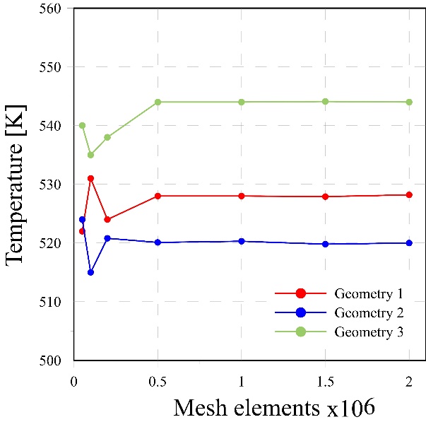 The number of elements of a mesh determines how thin it is. Notice that the more number elements, the more accuracy is obtained within the calculations. However, more computing sources will be required. As a result, longer iteration times. Therefore, it is necessary to carry out a mesh independence analysis in order to determine the optimal point where stability in the calculations is reached. Fig 4 shows the temperature results obtained at a central point of each geometry by varying the number of elements of the tetrahedral mesh used.