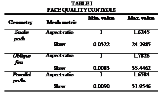 A good mesh quality ensures better results for the CFD analysis as it minimizes the computational demand for the appropriate prediction of the phenomena. SALOME software, in which the meshing process was carried out, used the corresponding algorithm to calculate the defined geometric characteristics of the different elements that construct the mesh domain. There are different quality control criteria, including aspect ratio and skew. The first reveals the degree of conformity of a mesh element to the regular element of its type. The second reflects the angle between the lines that join opposite sides of a quadrangle element or the greatest angle between three medians in triangle elements [30]. The values obtained for these parameters are within the acceptable range defined by the software, as summarized in Table I.