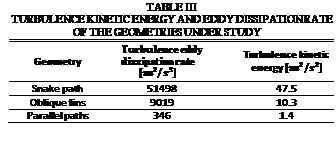 Finally, Table III shows the values of the turbulence eddy dissipation rate for each of the geometries, indicating that the third geometry (parallel path) is the one with the best behavior with respect to this factor, having a TEDR of 346