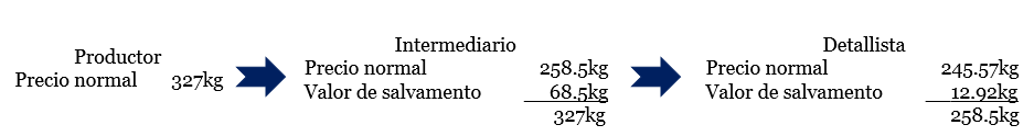 Con relación a las cantidades de compra y venta entre los eslabones en la situación actual presentadas en la Fig. 1., son tomadas a partir de los resultados obtenidos del estudio de campo realizado a los pequeños productores de cítricos en el departamento del Valle del Cauca. Se observa que la cantidad transferida del productor al intermediario se distribuye entre la cantidad vendida a precio normal (correspondiente a cerca del 80% del total) y la cantidad vendida a precio de salvamento (correspondiente al 20% restante). Por su parte, el intermediario transfiere 258.5kg al detallista; el cual vende el 95% del producto a precio normal y 5% a precio de salvamento.