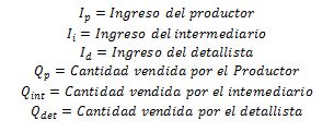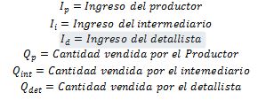 (5)Las ganancias tanto del productor como del intermediario y detallista, se calculan como la diferencia entre los ingresos por venta menos los costos asociados a cada eslabón, es decir: