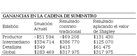 El resultado obtenido en términos de distribución del ingreso que se presenta en la tabla VI, refleja el comportamiento en cada uno de los eslabones, en la situación actual y después de aplicar el contrato de cantidad flexible. Se observa que, aunque el desempeño global de la cadena en términos del ingreso mejora; el ingreso en cada uno de los eslabones expresado como porcentaje del ingreso global, no cambia sustancialmente. En la tabla 5, se pueden ver los datos obtenidos aplicando el valor de Shapley donde se observa la mejor distribución de los ingresos obtenidos una vez realizado el procedimiento. Lógicamente estos resultados sugieren un ambiente de negociación colaborativo, dado que las utilidades y por tanto los ingresos mejoran para el productor y el detallista, siendo el intermediario el afectado una vez se aplica el valor de Shapley, lo que se convierte en una limitación para su implementación.