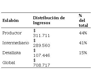 Como resultado de la aplicación del valor de Shapley con base en el aporte marginal de utilidad de cada eslabón a las ganancias totales de la cadena se obtienen los porcentajes de distribución de ingresos presentados en la Table III.