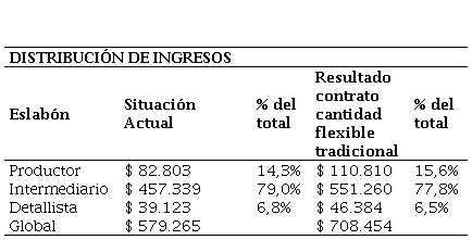 Los resultados en términos de ingresos por eslabón para la situación actual y los arrojados después de aplicar el modelo de contrato de cantidad flexible se obtiene mediante la siguiente formulación: