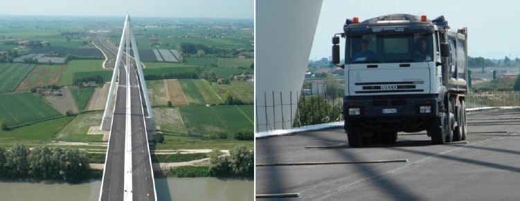 El puente atirantado “Ponte sull’Adige” de 310 m de luz central, en el norte de Italia (Fig. 10), fue estudiado por [88] mediante pruebas dinámicas usando vehículos pesados a velocidades constantes, y con una serie de obstáculos rectangulares igualmente espaciados. Las vibraciones inducidas fueron registradas por acelerómetros. La posición, la distancia entre obstáculos, y velocidades del vehículo se seleccionaron con base en un modelo numérico de elementos finitos. El vehículo pesaba 40 Ton circulando a velocidades entre 5 y 35 km/h, los resaltos tenían 400 mm de base por 30 mm de alto espaciados cada 15 m. La frecuencia de muestreo fue 100 Hz con tiempos de ventana de datos de 240 a 400 segundos. Los datos recolectados fueron procesados usando técnicas como método exponencial complejo de número cuadrados (LSCE) y la técnica de disminución aleatoria (RDT). Los autores lograron identificar 4 formas modales de flexión y 2 modos torsionales. [85] concluyeron que el sistema de pruebas implementado fue efectivo para proporcionar una cantidad adecuada de energía al puente en el rango de frecuencias de interés. Las pruebas dinámicas realizadas en esta tipología de puentes atirantados, en aras de identificar propiedades dinámicas o factores de amplificación dinámica, han sido reportadas por [89],[90], en donde se destaca el uso de camiones pesados circulando a ciertas velocidades atravesando resaltos dispuestos sobre el tablero.