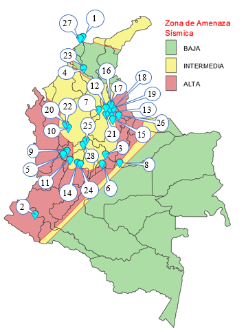 La tabla 1 presenta 28 puentes de luz mayor a 50 m, predomina la tipología de sección viga cajón construidos por voladizos sucesivos, y tan solo 3 puentes de ese grupo han sido estudiados y documentados. Para los 25 puentes restantes no se encontró investigación alguna. En la figura 12 se muestra la ubicación geográfica de los puentes mencionados en la tabla 1 sobre un plano de las zonas de amenaza sísmica de Colombia, evidenciando que el 90% de estos puentes se encuentran localizados en zonas de amenaza sísmica intermedia o alta, esto resalta la importancia de desarrollar e implementar estrategias para el monitoreo de la salud estructural de puentes. En las investigaciones realizadas en el entorno nacional en puentes de grandes luces por [21]–[23], [72] , ha predominado el uso de vibraciones ambientales para la caracterización dinámica. [21] ha hecho énfasis en complementar estos estudios con pruebas de vibración forzada con el fin de enriquecer la caracterización dinámica y detectar modos de vibración que no han sido posibles de identificar con pruebas de vibración ambiental. En vista de la ausencia de pruebas FVT en puentes de grandes luces en Colombia, son necesarias investigaciones y campañas experimentales encaminadas a generar conocimiento y desarrollo de técnicas y/o métodos, que incorporando experiencias internacionales, puedan ser contextualizados al entorno nacional abordando los factores que intervienen en la adecuada identificación modal, como lo son la fuente de excitación y la ubicación de sensores en el puente.