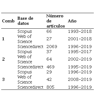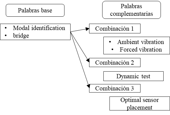 Para profundizar en el conocimiento de técnicas para ejecutar campañas experimentales para la caracterización dinámica principalmente con aplicación a puentes viga cajón de gran luz construidos por voladizos sucesivos y con base en las pautas enunciadas por [25], [26] se realizó un análisis bibliométrico siguiendo las etapas de planeación, ejecución de la revisión y reporte de los resultados. La selección adecuada de las palabras claves juega un rol importante en la calidad de la información obtenida. Teniendo en mente el objetivo trazado y las ideas base que permitieron formularlo, se tomaron palabras claves como: modal identification, bridges, dynamic test, forced vibration, ambient Vibration y optimal sensor placement que fueron combinadas de tres formas. La figura 1 presenta las palabras claves y las combinaciones ingresadas en las bases de datos Scopus©, Web of Science© y Sciencedirect©