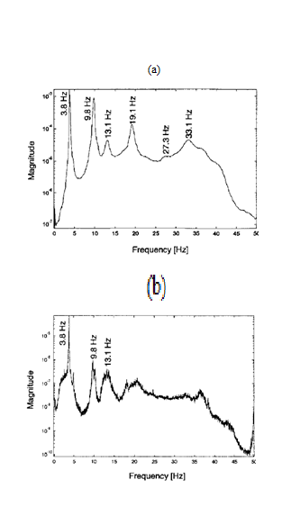 Continuando con las investigaciones en el puente Z24, [40] ejecutaron pruebas FVT y AVT usando como fuente de excitación artificial la caída de objetos para generar impactos y excitaciones ambientales, respectivamente. El puente fue instrumentado en 58 puntos con registros de aceleraciones verticales. El objeto pesado se dejó caer en un único punto durante 4 veces registrando vibraciones alrededor de 82 s., con lo cual lograron identificar 6 formas modales con picos de frecuencias bien definidos. Con respecto a las pruebas AVT, conservaron igual ubicación de sensores y registraron datos durante 655 s., mediante el procesamiento de las señales, identificaron 4 formas modales con picos de frecuencia distorsionados como se puede apreciar en la figura 5.