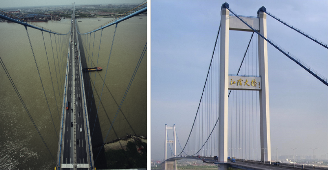 El puente colgante Jiangyin (Fig. 6) en China fue objeto de estudio por investigadores de Reino Unido y China [19] con el objetivo de realizar pruebas de vibración antes de la puesta en servicio del puente. Debido a la gran luz central del puente (1385 m), realizar las pruebas representaba un desafío para la instrumentación debido al rango de frecuencias, resolución y longitud a instrumentar. Para esto, [19] desarrollaron un sistema de sensores autónomos sincronizados con precisión, sin uso de cables o comunicación GPS. El ejercicio consistió en la planificación de una campaña de prueba para optimizar la confiabilidad del análisis modal operativo con el objetivo de identificar parámetros modales con bajas frecuencias propios de esta tipología de puente. Para ejecutar las mediciones usaron 15 acelerómetros uniaxiales ubicados cada L/22 en la luz central. Las mediciones se realizaron en 3 días consecutivos utilizando 12 configuraciones de sensores, y con una duración de 60 minutos. cada configuración. Los investigadores lograron identificar 20 formas modales, la menor frecuencia detectada fue 0.05 Hz y la mayor 0.61 Hz.