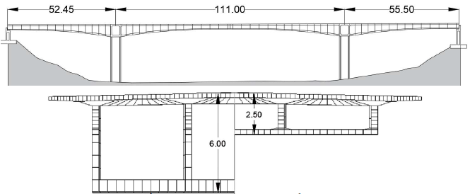 El puente Guillermo Gómez Ortiz (Colombia) de sección viga cajón construido por voladizos sucesivos de 170 m de luz central y ancho de carril de 11 m con 2 carriles de circulación, fue instrumentado por [21] con el objetivo de realizar pruebas AVT cuyos resultados de parámetros modales sirvieron de insumo inicial para la calibración del modelo numérico en elementos finitos. La información recolectada por los sensores triaxiales de fuerza balanceada empleados fue procesada usando el software ARTeMIS© con la técnica EFDD. La investigación desarrollada por [69] fue pionera en el estudio de propiedades dinámicas en puentes de sección viga cajón construidos por voladizos sucesivos en Colombia. [69] identificaron formas modales en la dirección transversal del puente y afirman que “el paso de vehículos en el puente fue poco frecuente, lo cual, combinado a la gran rigidez del puente estudiado, dificultó la identificación de modos de flexión”. A razón de esto, los autores recomendaron el uso de métodos de vibración forzada para identificar otras formas modales en este tipo de estructuras como ser traslación longitudinal y flexión vertical.