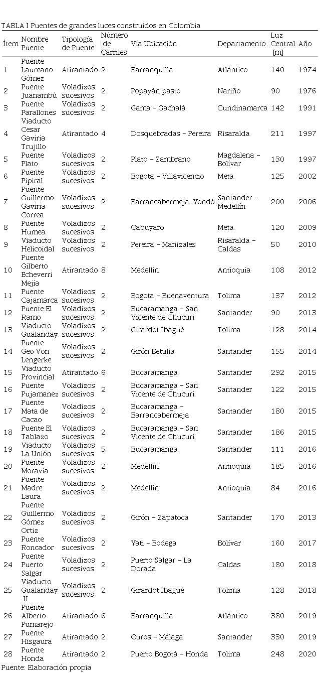 EN los últimos años el gobierno nacional ha impulsado la renovación de la infraestructura vial con inversiones en el programa de vías de Cuarta Generación (4G) apuntando a superar el rezago vial de las últimas décadas con la construcción 1500 km de vías de doble calzada y numerosos puentes para salvar grandes luces, algunos de ellos, de tipología viga cajón construidos por voladizos sucesivos fundidos “in situ”. La tabla 1 presenta algunos de los puentes de grandes luces de sección viga cajón construidos en los últimos años en Colombia. A partir de la tabla 1 se observa que la construcción de puentes aumenta a partir de 2010, impulsada por el programa de vías de 4G, donde predomina el uso de 2 carriles. Se puede inferir que la tipología de puente de voladizos sucesivos es dominante para luces entre 50 y 200 m con el 75% de los puentes presentados en la tabla 1. La tipología de puente atirantado es usada, en su mayoría, para luces mayores a 200 m donde se empiezan a presentan limitaciones constructivas para los puentes por voladizos sucesivos. La tipología de puentes construidos por voladizos sucesivos es propensa a presentar problemas de grandes deflexiones en el centro de luz que se manifiestan con paso de los años. Este tema de deflexiones excesivas ha sido estudiado por autores como [1]–[4] y dejan en manifiesto la incertidumbre que generan los modelos actuales para predecir fenómenos dependientes del tiempo como Creep (deformación por fluencia lenta del concreto) y Shrinkage (retracción del acero de refuerzo y postensado). La cantidad de puentes construidos en Colombia de esta tipología en específico y su inherente patología la sugiere como centro de estudio en esta investigación. Manterola [5] menciona que son varios parámetros que pueden servir para la clasificación de puentes como es el material, la luz y el proceso constructivo. De estos parámetros, el más útil para la clasificación de puentes es la luz, la cual condiciona el proceso constructivo adecuado y la configuración de la sección transversal en función del material de construcción. En función de la luz, el autor afirma que la concepción de puentes de grandes luces aplica para luces mayores a 50 m, ya que esta distancia determina el tipo de proceso constructivo a utilizar.