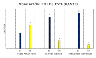 Realizando una indagación sobre la disposición de los 30 estudiantes donde las preguntas en relación fueron: ¿Les gusta la física y las matemáticas? ¿Le parece difícil la física y la matemática? ¿Tienes habilidades básicas para navegar en Internet? En ellas los educandos tuvieron la opción de responder Si o No, cuyos resultados se vieron reflejados en la figura 2, mostrando a partir del diagrama de barras que el 40% de los estudiantes tienen gusto por las matemáticas y física, siendo la mayoría de ellos, el 80% de los educandos les pareció que la física y las matemáticas son difícil de estudiar, mientras que hay una pequeña cantidad del grupo que sienten tener facilidad por aprender las asignaturas mencionadas. El 90% de los aprendices presentaron tener habilidades básicas para navegar en Internet y solo algunos manifestaron tener inseguridad al interactuar con páginas de internet.
