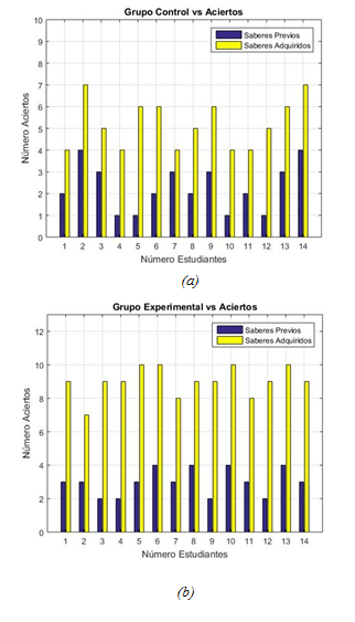 En la figura 3 (b), para el grupo experimental se visualizó un desempeño bajo al responder las 10 preguntas del formulario de saberes previos, donde después de aplicar la metodología de aprendizaje por descubrimiento, los educandos obtuvieron unos desempeños altos y superiores, resaltando a cuatro de ellos que llegaron a responder las 10 preguntas correctamente.