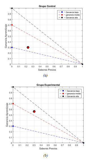 Para comprender mejor este resultado, se muestra en la figura 4 la gráfica de zonas de ganancia propuesta por Hake, en la figura 4 (a) se tiene el análisis para el grupo control y en la figura 4 (b) se tiene el análisis para el grupo experimental, ubicando el grupo control en la zona o nivel de media ganancia, y el grupo experimental en la zona o nivel de alta ganancia obtenida en la presente investigación; además, el eje horizontal representa el puntaje promedio del formulario inicial (normalizado) y el eje vertical representa la ganancia real promedio (normalizada) [18].