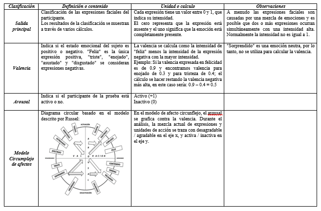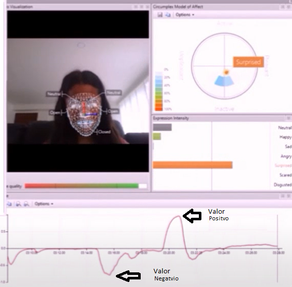 En la Fig. 10, se muestra un cuadro de análisis a través del FaceReader en el cual se observa cómo se relacionan el modelo circumplejo de afectos, las barras que muestran la intensidad en la expresión de la emoción y la valencia que nos indica si la emoción es sentida (cuando está por encima de cero (positiva)), o si es expresada pero no sentida (cuando la valencia está por debajo de cero (negativa)).