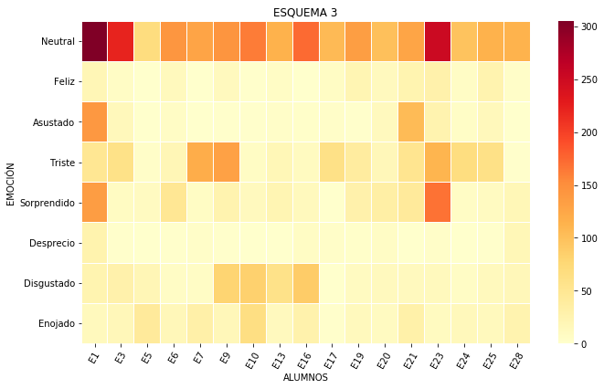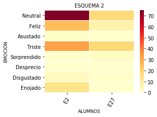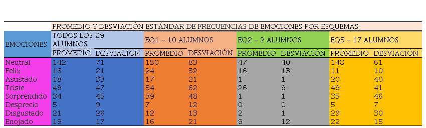 En la siguiente tabla se muestran el promedio y las desviaciones Estándar de las emociones por esquemas, que los hemos denominado –EQ1, EQ2 y EQ3–. En la Tabla I se muestran los resultados iniciales y generales que nos proporcionó el FaceReader del análisis de los 29 alumnos que participaron en esta investigación.