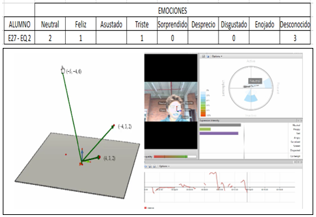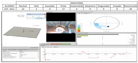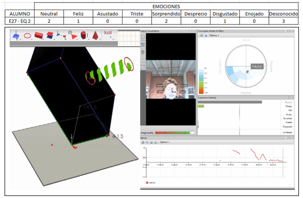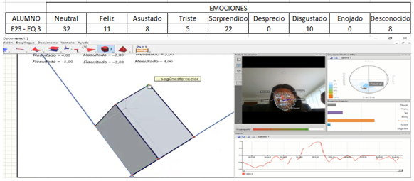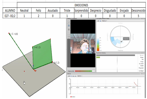 Se aprecia en la Fig. 12, que el conteo de la emoción más expresada y sentida en EQ2 es también la neutral, seguida de felicidad y en tercer lugar asustado. Podemos apreciar que “asustado” aparece en esa posición, pero tiene un menor conteo que triste y enojado en el estudiante E2. Para el caso del estudiante E27 hay un menor conteo en la expresión de la felicidad y mayor conteo en la tristeza. Nuevamente, podríamos inferir que un mayor conteo de emociones negativas estaría relacionado con un menor procesamiento cognitivo y menor capacidad para la solución de problemas matemáticos. Es de anotar que los dos estudiantes clasificados en este esquema lograron realizar la construcción del OMP con la utilización del software Cabri 3D.