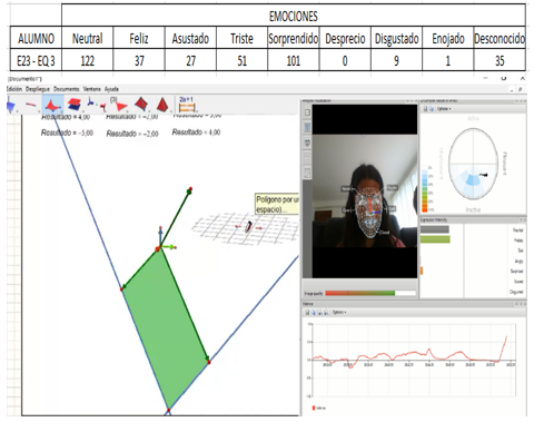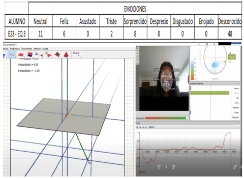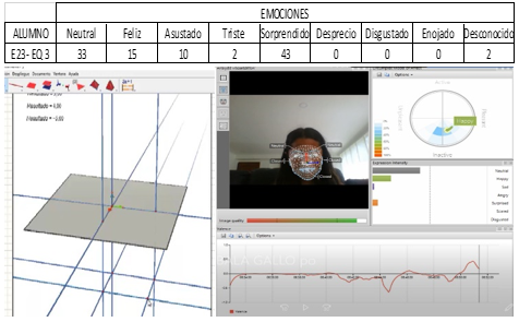 Se aprecia en la Fig. 13, que nuevamente la emoción más expresada y sentida en EQ3 es la neutral, seguida de tristeza y sorprendido. Por su parte, las de menor conteo fueron desprecio, enojo y felicidad. Es importante notar que el bajo conteo de las emociones negativas en este esquema señala un posible mejor control emocional, lo que podría estar vinculado a un alto proceso cognitivo al momento de una solución de problemas matemáticos. Es de notar que los alumnos clasificados en EQ3 lograron realizar la construcción del OMP con el uso lógico del software Cabri 3D.
