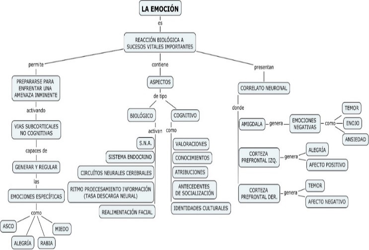 El estudio de las emociones ha ocupado un amplio periodo de tiempo de la historia de la psicología como ciencia, Según Vigotsky (1926) [12]a partir de finales del siglo XIX encontramos las dos más importantes propuestas sobre el estudio de las emociones planteadas por Lange y James basadas en las cuales se desarrolló el trabajo sobre éstas en el siglo XX. Evolutivamente nuestro cerebro logro generar emociones y sentimientos, su investigación nos remonta al estudio de la recompensa, el castigo, los impulsos, la motivación y los sentimientos. La emoción está ligada a la regulación de la vida, la homeostasis, y está conformada por una serie de dispositivos biológicos que le permiten construir un conjunto heterogéneo de fenómenos a los que llamamos “emocionales”, lo que hace necesario diferenciarla de los sentimientos. En la Fig. 1, se presenta un mapa conceptual a través del cual se muestra un desarrollo del concepto de emoción.