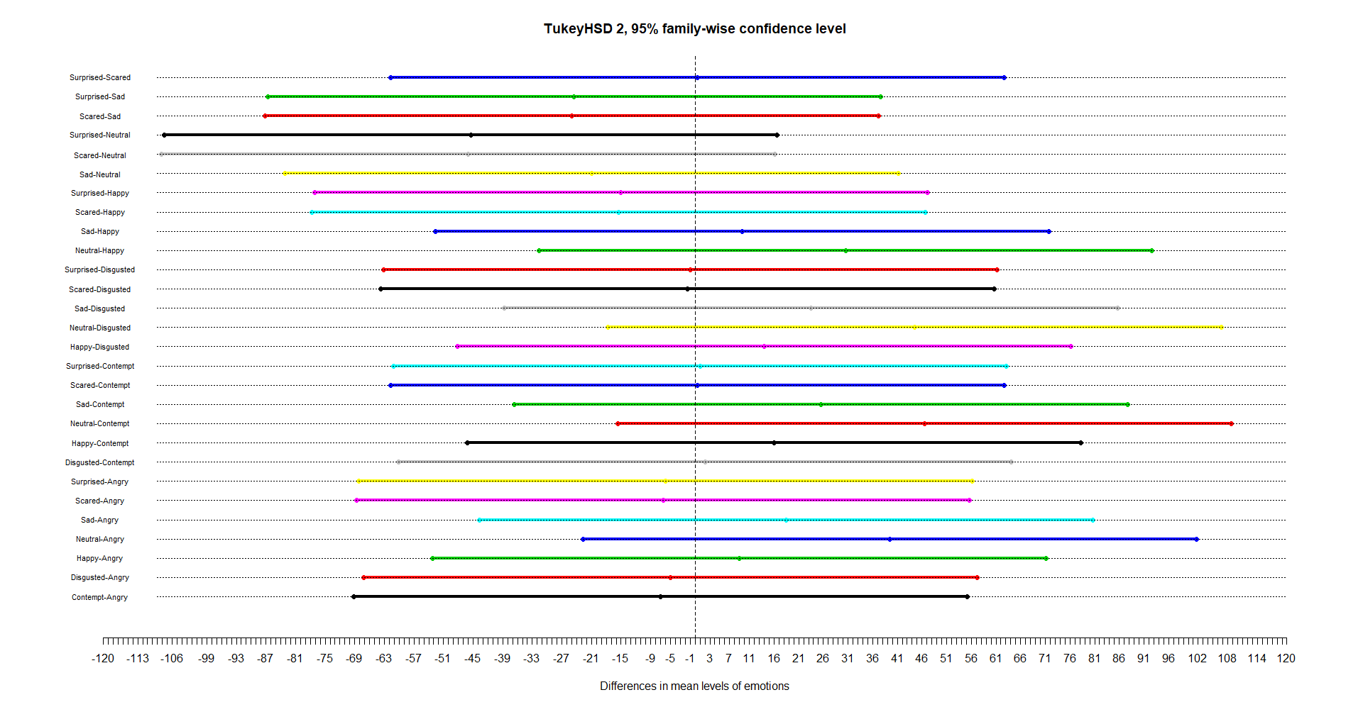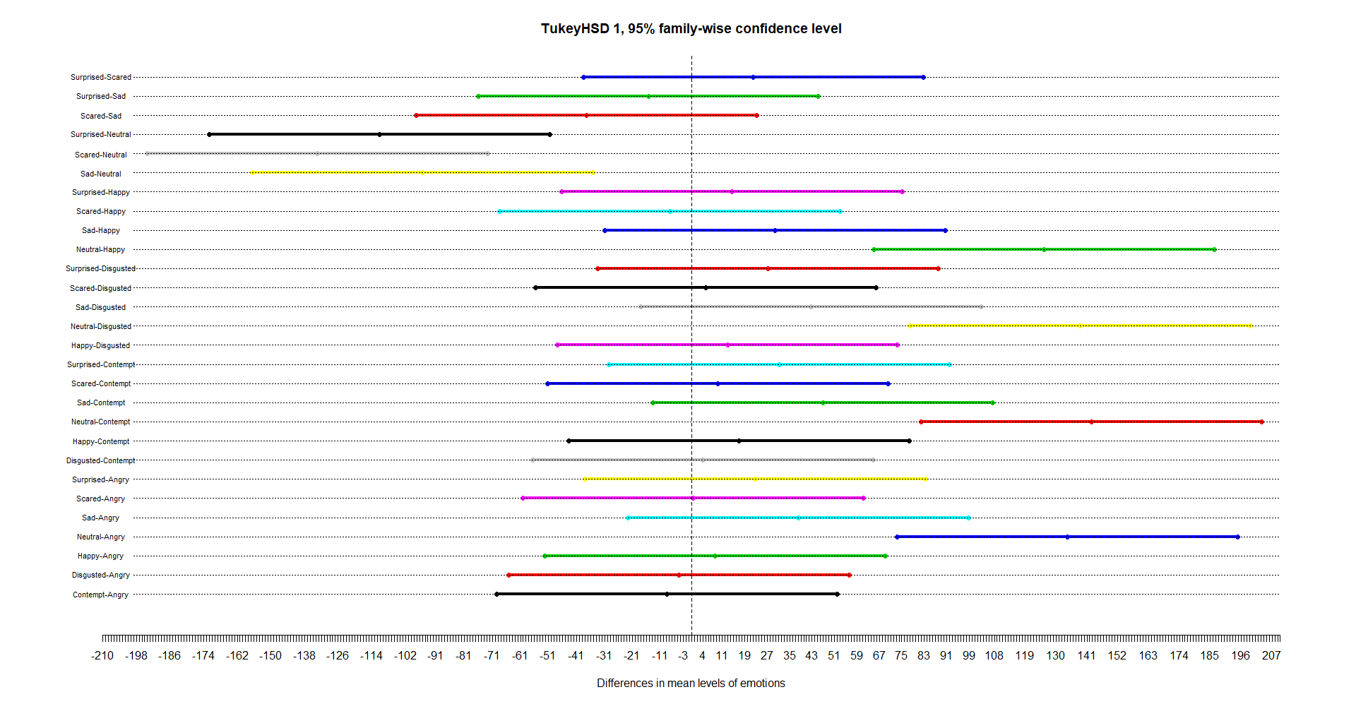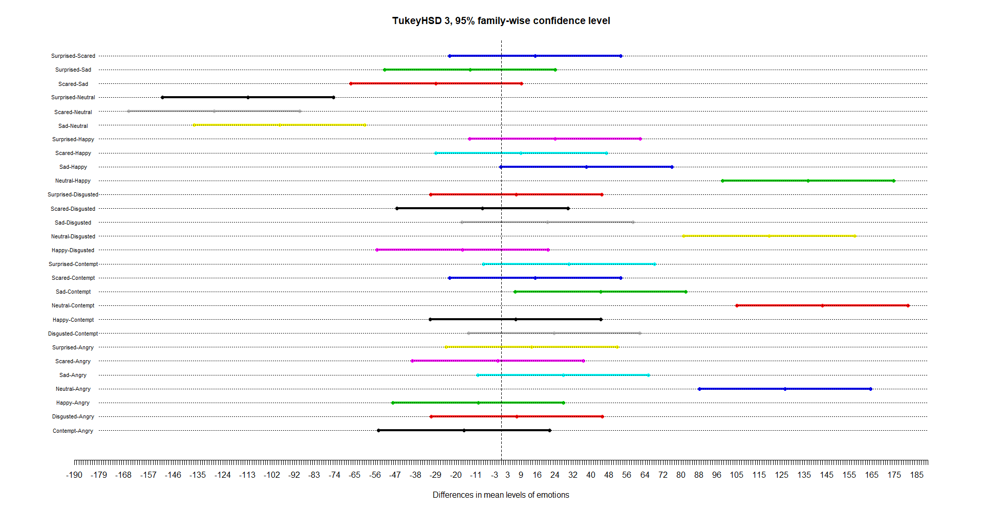 Al analizar cada esquema en el gráfico de frecuencias de las Fig. 22, 23 y 24 se observa que las longitudes de las barras significan la mayor discrepancia o no con respecto a la caracterización de la diferencia entre las emociones, si las barras están moviéndose hacia la derecha o hacia la izquierda, pues logran salirse por completo del cero, es decir, las que estén más alejadas del cero, significa que hay más diferencia entre las emociones que se estén relacionando, ahora si las barras muestran que son más cortas, lo cual se refleja en grafico EQ3 de la Fig. 24, por lo se puede decir que la discrepancia estadística es menor, en otras palabras, hay más certeza de que esas medias y esas diferencias de medias están bien estimadas, o sea que las emociones presentadas en el EQ3 son más confiables.