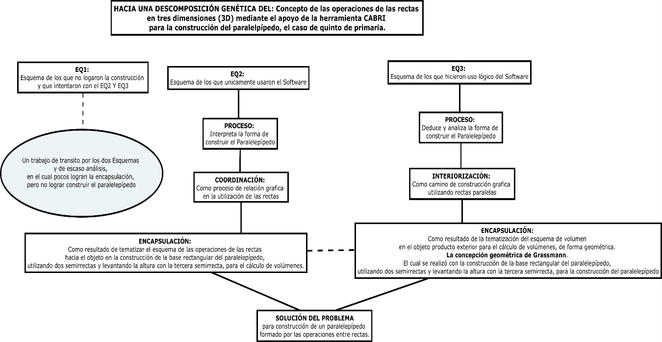 En [14], se utilizaron los mecanismos mentales, de coordinación o de interiorización de las acciones del objeto matemático, cuando el estudiante comienza a considerar una operación como un tipo de transformación en tripletas ordenadas de elementos de un conjunto de puntos, en donde se consigue observar que la figura poliedra se puede formar usando estos puntos ya situados en el espacio. Esto significa que el estudiante ha construido una estructura mental que realiza la misma transformación que la acción, pero totalmente en su mente; para ello, y con base en el análisis de los resultados obtenidos, hemos estructurado una descomposición genética que consta de tres esquemas, primer esquema –EQ1 esquema que no lograron la construcción y que lo intentaron–, el concepto geométrico de la operación de rectas para la construcción del paralelepípedo dados tres puntos en el espacio, con coordenadas (x, y, z) es tratado como un elemento, ya que el estudiante solo se limita a buscar la forma de ubicarlos en el espacio; se diseña también el segundo esquema –EQ2 esquema con el uso del Software–, como una entrada de operaciones computacionales de ubicación de los puntos dados; y finalmente el diseño de un tercer esquema –EQ3 esquema del uso lógico del Software–, como el objeto trascendente de un proceso de construcción geométrica en el espacio euclídeo que produce una secuencia de aplicaciones observadas en la construcción de la figura que surge de este. En cada uno de estos esquemas, la construcción del paralelepípedo es tratado como un objeto estático, aunque los procesos que los origina son dinámicos, como lo evidencia la construcción del OMP con el apoyo del software Cabri 3D.