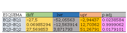 Entendida la prueba de Tukey como aquella capaz de comparar dos poblaciones desde la significancia de la diferencia entre las medias; bajo un error admisible. Entonces, desde la Tabla II puede concluirse que los resultados entre los EQ2-EQ1 y EQ3-EQ2 pueden considerarse iguales con un nivel de significación del 5%, dado que su Valor-p ajustado es inferior a este error máximo permitido, más no así el comparativo entre EQ3 y EQ1 donde sus resultados indican que ambas poblaciones son muy diferentes.