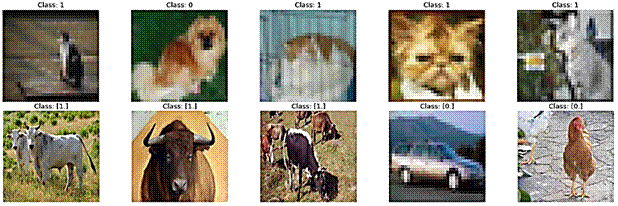 Our approach is tested on two databases. Firstly, we use the widely known CIFAR10[2] dataset as a benchmark for image-based object recognition from noisy and low-resolution samples [1,3,11]. CIFAR10 collects images of size 32x32 pixels, holding ten classes (airplane, automobile, bird, cat, deer, dog, frog, horse, boat, and truck), for a total of 60.000 images, divided into 50.000 samples for training and 10.000 for testing. We built a data subset composed of 2.000 images belonging to two classes: cat and dog. Then, we split this subset, 80% for training, and 20% for testing [24,25]. In turn, we collect a small cow database, termed IMGCOW, holding cow and no cow instances captured from farm-based scenarios. Chiefly, the IMGCOW dataset is composed of 1.500 images, as follows: cow (500 samples), chicken (200 samples), and horse (200 samples), all capture from the Animals-10[3] dataset. The remaining 600 illustrations were taken from the training set of the CIFAR10 collection. Again, 80% of the samples are randomly selected as the training set, and the remaining 20% for testing. Fig. 2 illustrates some examples of the studied datasets.
