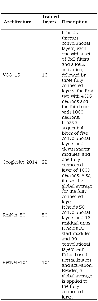 Transfer learning aims to reuse trained models across similar tasks. It is recently a popular approach in deep methods, where pre-trained models on large databases are used as the starting point on similar problems. In particular, such a process repeats the architecture, and fixing the weights of low-level layers, demonstrates exciting results for computer vision and natural language processing tasks. Concerning the image-based recognition problem, the most common CNN-based architectures include the VGG-16, the GoogleNet-2014, and the ResNet. Namely, the VGG-16 holds a low-complex architecture compared to the remaining networks since it contains a relatively small number of sequential convolutional layers. The GoogleNet-2014, also known as InceptionVn, where n refers to the Google updated version, presents a startup module that acts as extractors of multi-level features. At last, the ResNet, with its two versions ResNet50 and ResNet101, contains a more in-depth architecture than VGG-16 and GoogleNet-2014, combining convolutional layers with residual modules. Table 1 summarizes the essential properties of the networks above for image-based recognition.