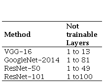 This study uses the pre-trained parameters of the networks exposed in Table I, obtained from the reduced version of the ImageNet collection (including 1000 categories, each with approximately 1000 images), as a common reference point for evaluating large-scale image classification models [4]. The proposed methodology consists of using the learned parameter from the ImageNet set to initialize the parameters of a particular network. Namely, we fix the lower layers parameters to initialize the feature mapping generation stage. Then, we solve the following optimization problem: