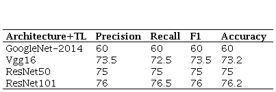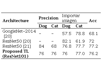 Table III shows the results of the first experiment (cat vs. dog from CIFAR10 subset). The ResNet101 network obtains a performance of 76.2% and outperforms in 1.2%, 3%, and 16.2% the other ResNet50, Vgg16, and GoogleNet-2014 architectures, respectively. Besides, the obtained results report that the transfer learning approach generates better performance in architectures with residual units: ResNet101 and ResNet50, whose difference in all the evaluation metrics does not exceed 1.3%. The overall ResNet101's account (our approach) exceeds the remaining architectures by 6.8% on average.