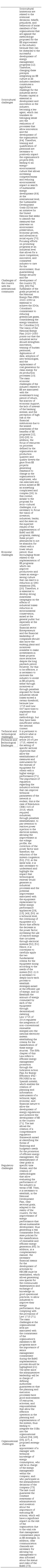 From the organizational point of view, strong leadership is essential for guiding the habits and customs of the members of the organization towards a culture of energy saving, this without forgetting that the support and encouragement of senior managers, in disposition and economically, is decisive for the performance of a correct exercise in EE [64],[32], [33]. Here, it is crucial to consider the stimuli that public entities offer to companies that implement EE programs, which has a significant influence on the process. Nevertheless, these motivators are not always visible or perceived as influential on decision-making for marked influence people within the organization. The last, together with the little belief of some individuals within companies regarding the benefits of these kinds of programs is one of the greatest limitations within the national context for the massification of EnMS in the industry [62],[53],[63]. In short, there is a need for greater dissemination of the benefits of these programs to increase the number of companies that dare to seek certification in energy management and thereby support these initiatives. Finally, it is crucial to highlight that the existing barriers in the country are also present at the international level in countries that seek to incorporate EE as a state policy [63].