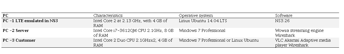 An emulation scenario was built in order to estimate QoE based on ITU-T Recommendation P.1203 and carry out a performance comparison of the DASH, HDS, HLS and HSS adaptive streaming techniques under real operating conditions. The scenario was previously proposed in [25] and then adapted and validated in [26] and [27]. This scenario is made up of three personal computers (PC), the characteristics of which can be seen in Table I. Fig. 1 shows the diagram of deployment of the emulation system.