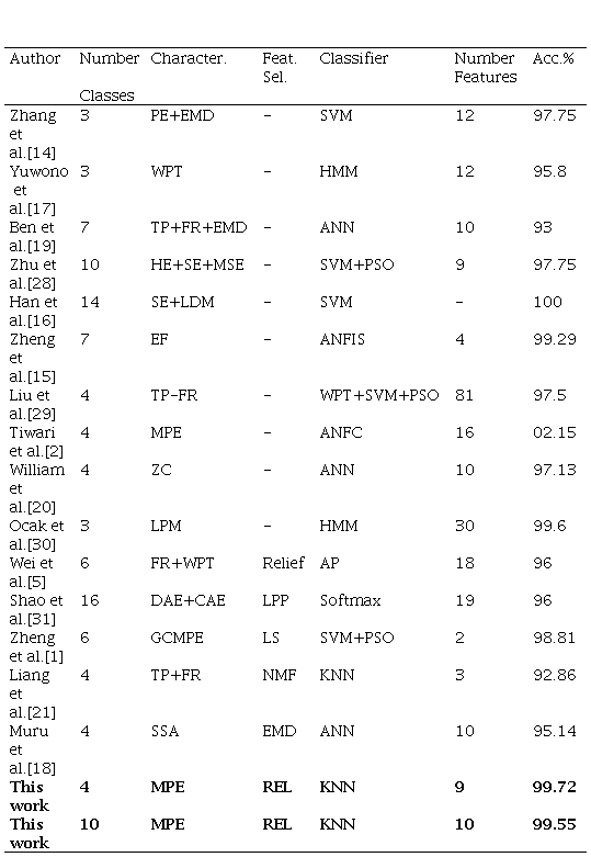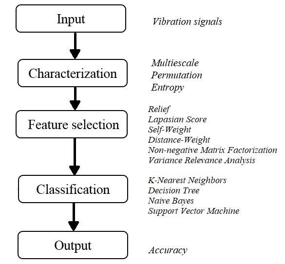 Bearing systems play an important role in rotary machines and in the modern manufacturing industry. Different methodologies have been developed for the detection and diagnosis of faults in its main components [1]. Generally, these diagnoses are made from the capture and processing of vibration signals, since they contain relevant information about the state of the machine [2]. However, these signals have a large number of non-stationary and non-linear characteristics, since their capture inevitably takes place with friction and impacts. To overcome this problem, a series of techniques have been developed for processing and classifying these signals. A widely used approach is based on the analysis of temporal and spectral characteristics of vibration signals [3][4]. However, analysis in time, frequency and time-frequency domains are seriously affected by the signal length and sampling frequency of the capture [5]. To solve this problem another approach has been presented in recent years, which is based on entropy of different natures, such as Simple Entropy (ApEn) [6], Approximate Entropy (SampEn) [7], Multiscale Entropy (MSE) [8], Permutation Entropy (PE) [9][31] and Multiscale Permutation Entropy (MPE) [10]. All of the above mentioned have been used successfully for the characterization of signals of different nature. For instance, in [6] the ApEn is used for diagnosis and clinical monitoring in the area of physiology. In [11] PE is used for the classification of patients from EEG signals. Finally, in [1][8][32] is used the MPE and MSE for the identification and diagnosis of faults in bearing systems based on vibration signals. It should be noted that the MPE is an evolution of the MSE and the PE since it gives a much more complete measure of the nonlinear dynamic parameters of a system. MPE includes a combination of different scales and time delays, which identifies particularities that are not perceptible within other entropies [10][33]. All the previous methods of characterization allow to obtain a great quantity of information of the system that is being analyzed. When classifying, many of these characteristics can be redundant or irrelevant, which can create redundancy or over-training of the classifier, for which characteristics selection techniques are implemented, improving the quality and efficiency of the model. In the bearing fault diagnosis application, Variance based on Relevance Analysis (VRA) [1], Laplacian Score (LS) [12] and Relief (REL) [5] are normally used. After the selection of features, a classification process is performed with machine learning algorithms such as Multiple Vector Support Machines (SVMM) [1],[13], [14] and [15], Hidden Markov Models (HMM) [16] and Artificial Neural Networks (ANN) [17], [18] and [19]. However, these classifiers have a high degree of complexity, computation time and initial parameters that must be optimized. Few works have attempted to exploit the potential of less complex conventional classifiers, such as Nearest K-Neighbors (KNN) [20], [21], Decision Trees (TREE) [22] or Naive Bayes (BAYES) [21]. This paper proposes a methodology for the diagnosis of bearing failures based on characteristics of the MPE. To make it more efficient and effective, it is combined with some feature selection techniques and multiple supervised classifiers. The verification of the advantage of the chosen parameters is done by comparison with different ones used in the state of the art.