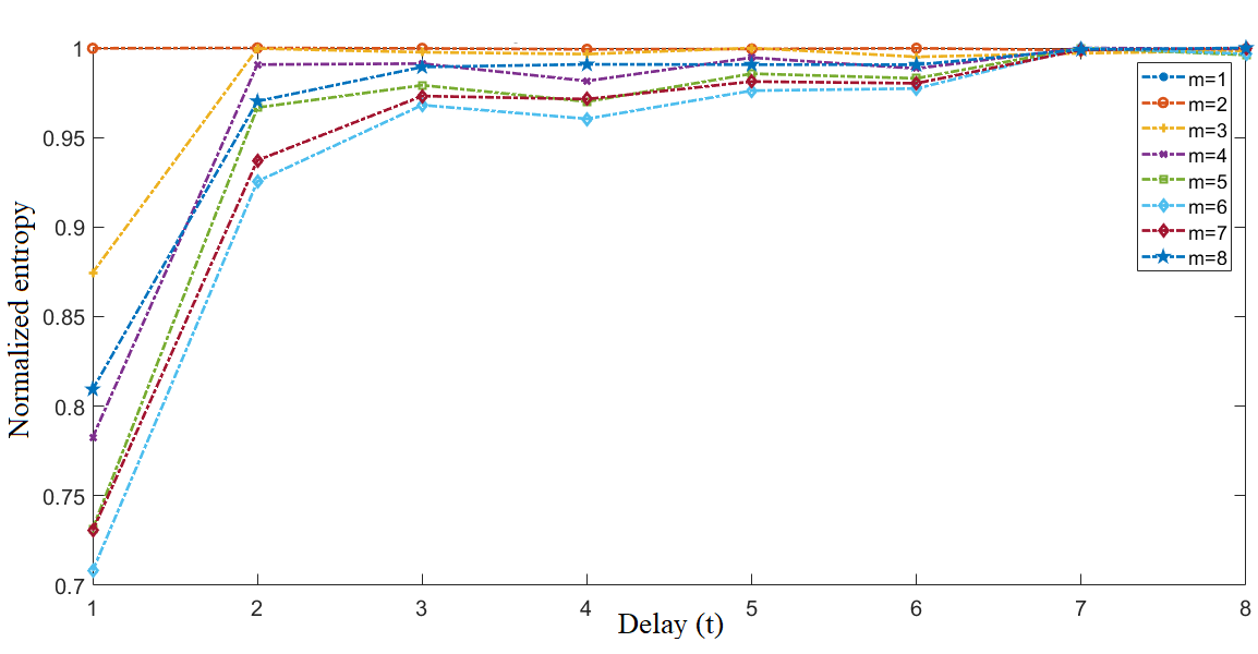 (1)Where xi ∈ R and p(xi) is the marginal probability. The time series can be represented with a delay of time and dimension given by (2):