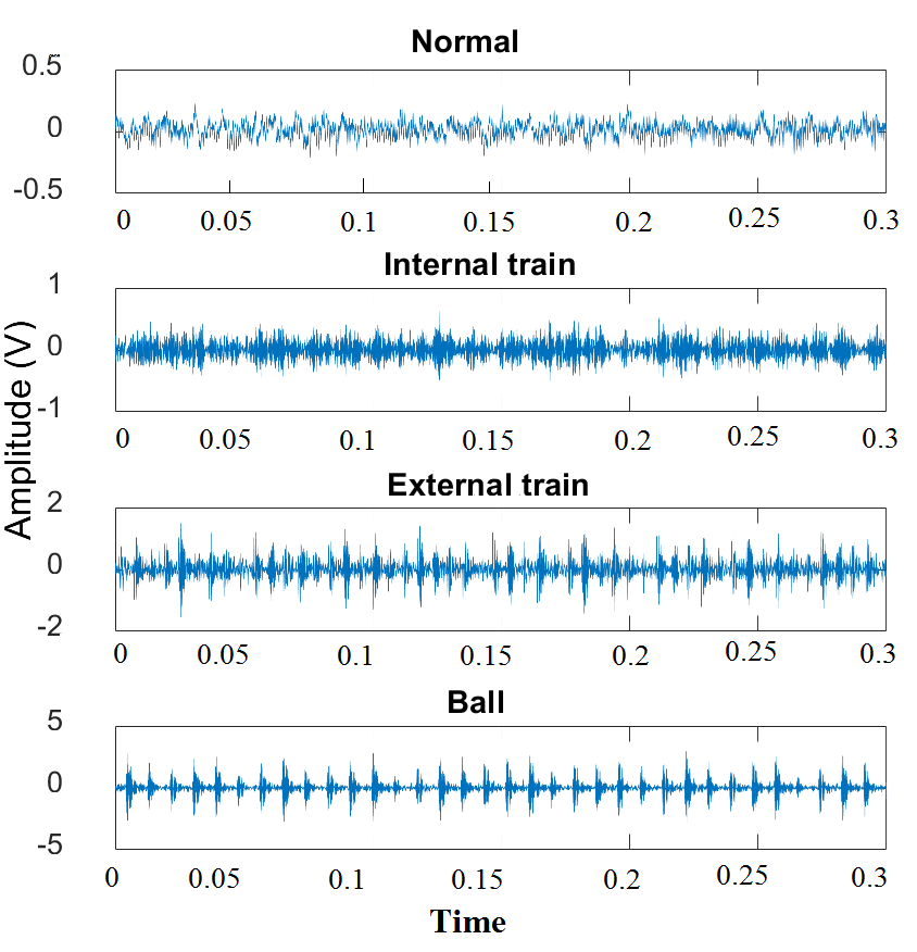 The validation of the proposed methodology is carried out by evaluation performed when classifying bearing fault signals obtained from the Case Western Reserve database [25]. In this database, signals were collected for the normal bearings (Nor), faults in the internal train (IR1), external train (IR2) and ball (BE). Faults are also found in order of severity, 0.007 inches in diameter to 0.040 inches in diameter and at variable engine speeds of 1720 to 1797 RPM. Each experiment was repeated three times and the data was collected at 12 kHz for 5 seconds. Each signal was divided into 10 sub-signals in order to have more samples per class and imitating the experimental framework established in the literature [26]. A sub-signal of each of the faults can be seen in Fig.3.