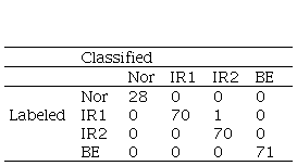 The proposed experimental methodology achieved a mean accuracy of 99.72% for classification of 4 different bearing system failures. Table IV shows the confusion matrix for this classifier.