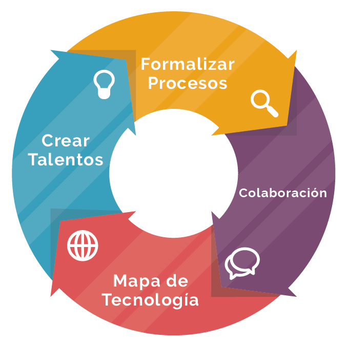 La estrategia está basada en un modelo cuya metodología ha de abordarse bajo cuatro componentes que consisten en: mapa de tecnología, colaboración, formalizar procesos y crear talentos.